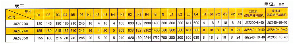 蝸輪蝸桿減速機(jī)規(guī)格主要有JWZ200\JWZ2410\JWZ350\JWZ460等,根據(jù)澄清池大小選擇合適的蝸輪箱。以下數(shù)據(jù)僅供參考: