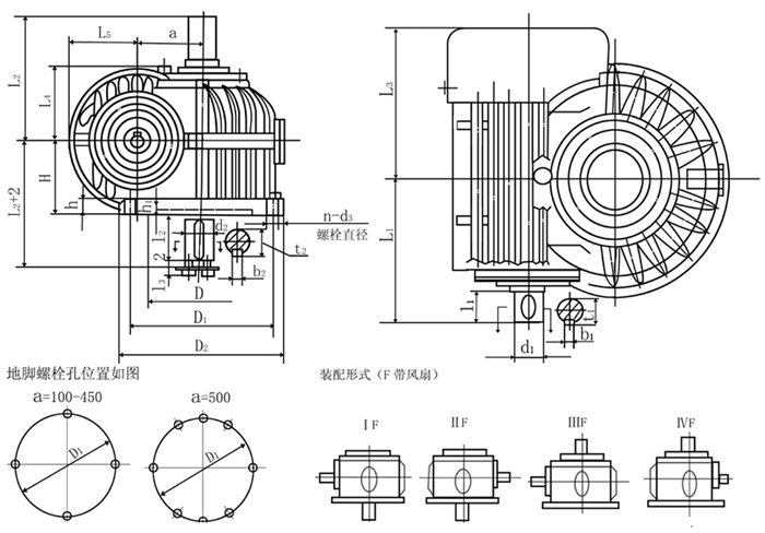 本系列減速器符合中華人民共和國國家標準(GB9147—88) 主要包括:CWU減速機蝸桿在下型 CWS減速機蝸桿在側型 CWO減速機蝸桿在上型 中心距有16種a=63、80、100、125、140、160、180、200、225、250、280、315、355、400、450、500。 傳動比有12種i=5、6.3、8、10、12.5、16、20、25、31.5、40、50、63